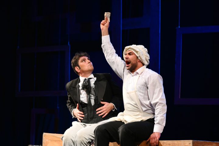 В спектакле много буффонады. Кажется, каждый из героев хоть раз да упал на сцене. Режиссёр придумал немало комичных трюков. Например, голодный Хлестаков пытается поймать муху, Городничий пишет письмо на спине Добчинского, стоящего на четвереньках, а карандаш смачивает во рту Бобчинского. Пиком буффонадой становится "танец маленьких лебедей", который исполняют Добчинский и Бобчинский, надев поверх своих сюртуков балетные пачки. На сцене в образах Одетты и Одиллии появляются Анна Андреевна и Марья Антоновна, смешно танцующие под музыку Чайковского.